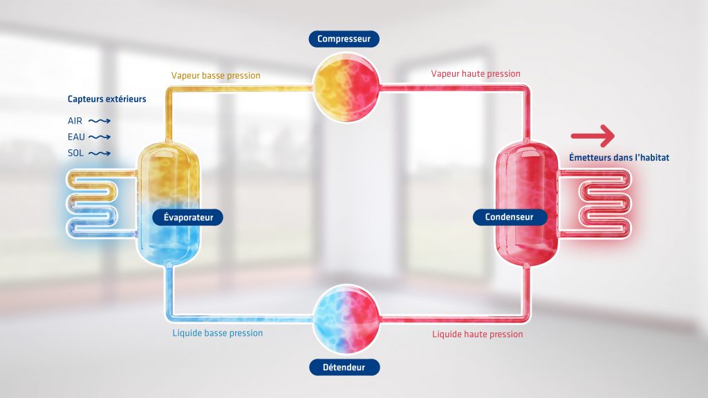 L’unité extérieure permet de puiser les calories de l’air et l’unité intérieure, matérialisée par un ventilo-convecteur, les restitue sous forme de chaleur dans la maison. Cette transformation des calories de l’air en chaleur est rendue possible grâce au fluide frigorigène circulant entre les deux unités.